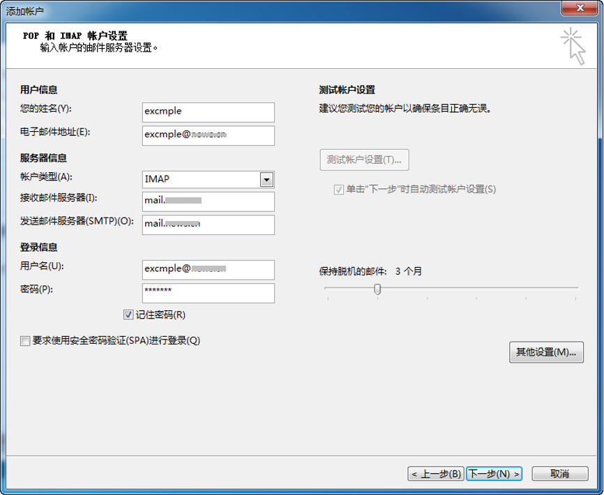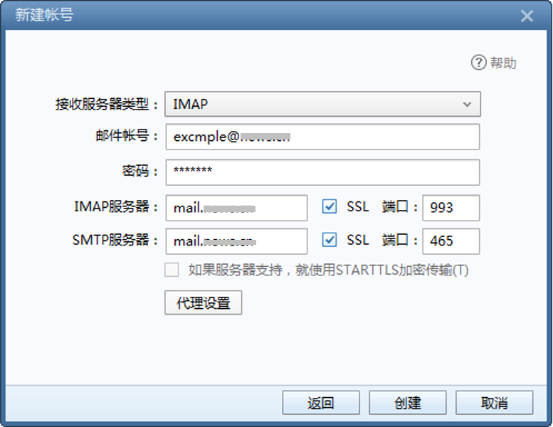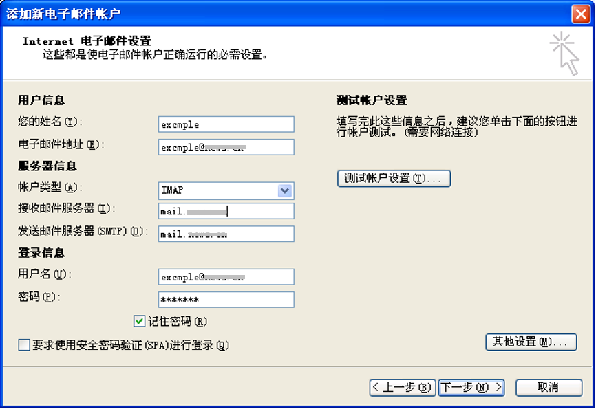 4. 选择IMAP方式,输入账号和密码以及服务器信息,注意选择SSL加密,如下图:配置帐号excmple@xxx.com: