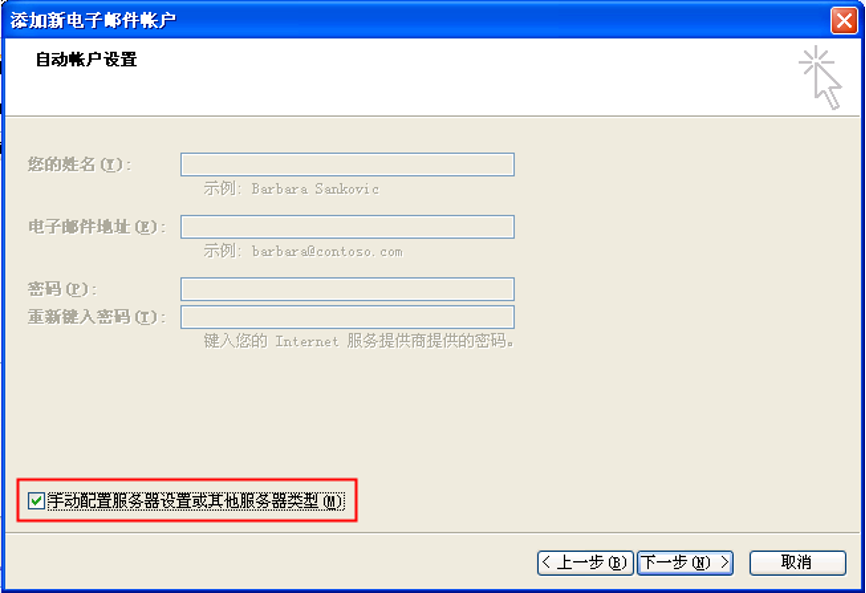 4. 勾选【手动配置服务器设置或其他服务器类型(M)】,点击【下一步】,如下图: