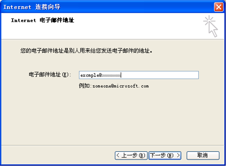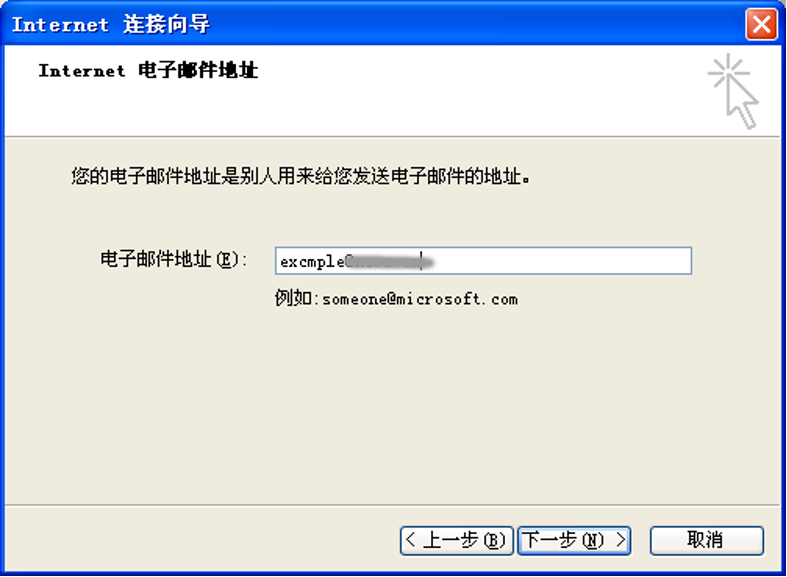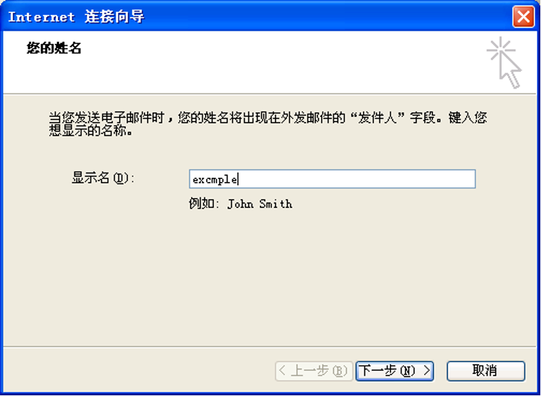 1.运行Outlook Express,Windows系统自动启动Internet连接向导的电子邮件设置。在“显示姓名”后的文本框里键入您想显示的名称,如图: