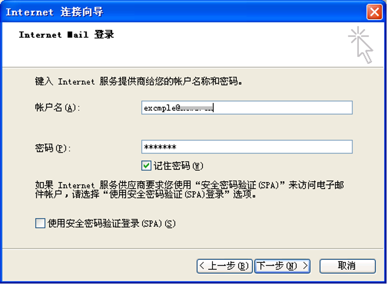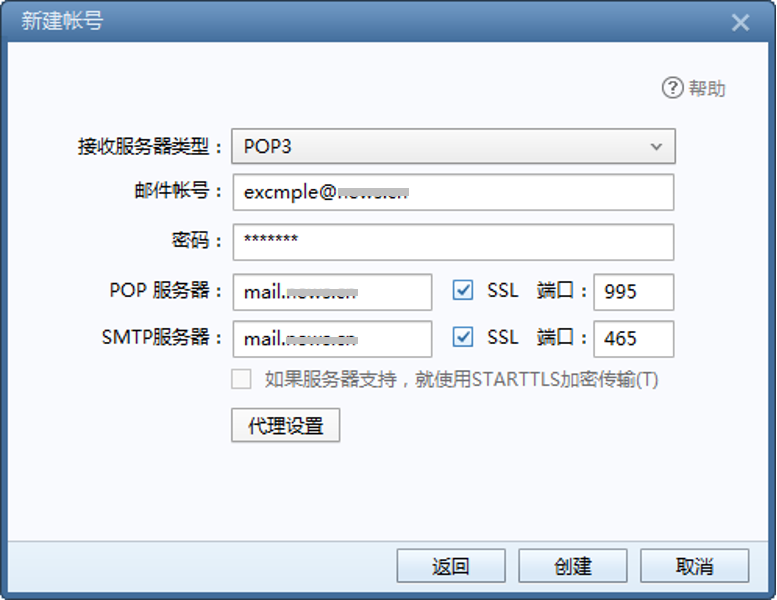 4. 选择pop3方式,输入账号和密码以及服务器信息,注意选择SSL加密,如下图:配置帐号excmple@xxx.com: