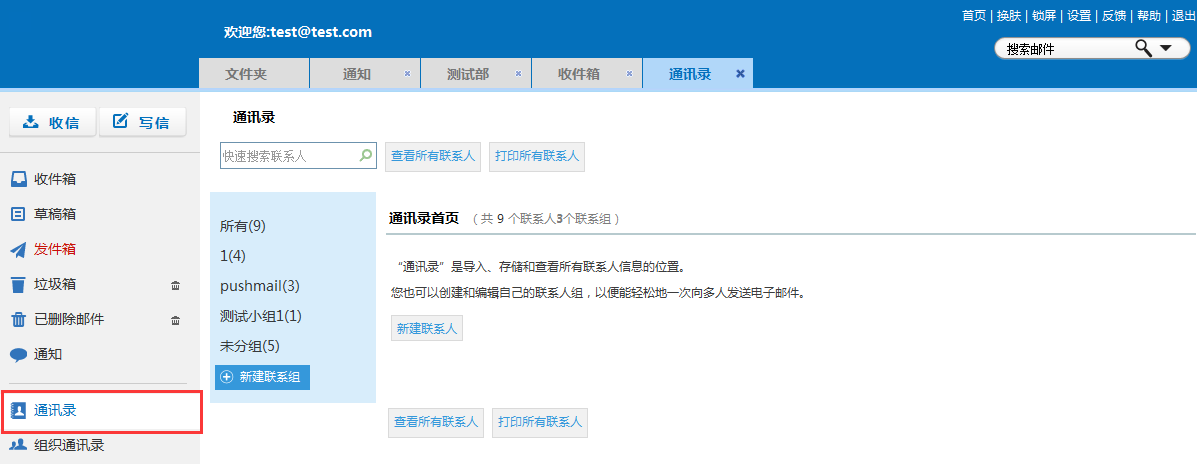 邮箱登录后默认页面,直观的显示了邮箱结构,首页的左边列出了收信、写信、各邮件夹、通讯录、日程、网盘、高级搜索。首页上边包括换肤、搜索、锁屏、设置、帮助、退出等。如下图:
