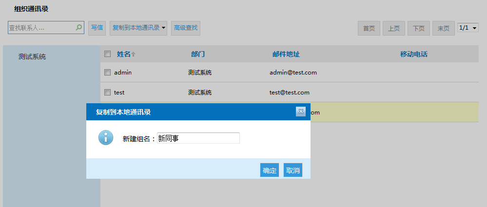 您可以按照“部门、邮件地址、姓名、移动电话、联系地址”进行模糊查询,上图中,是在软件部及其子部门中,查找邮件地址包括liyanhui的联系人,输入您的查询条件,点击“搜索”按钮,系统会自动为您定位要查找的联系人记录。