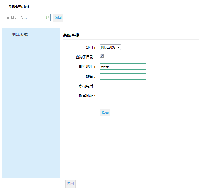 组织通讯录中,系统为您提供了高级查找功能,这样你就能更快、更准确的定位到要查找的联系人。点击“高级查找”按钮,进入高级查找页面,如下图: