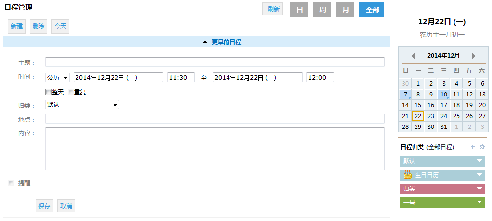 点击“全部”,在这里显示的是您的全部日程。点击“新建”按钮,进入新建日程页面,输入日程主题、确定日程时间、选择日程归类、添加日程内容,以及为日程设计提醒,