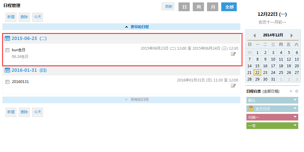 生日日程与您的个人通讯录紧密相关,如果您为您的个人通讯录中的联系人添加了生日,在日程管理中自动为您生成该联系人的生日日程记录。如下图所示: