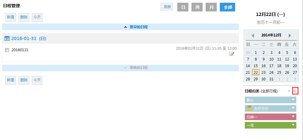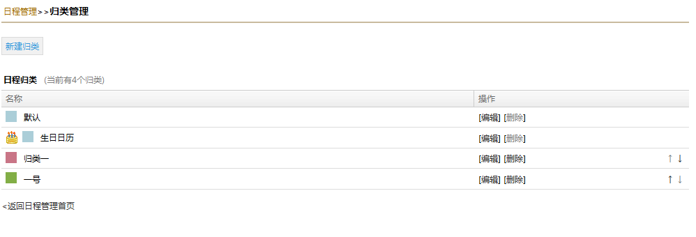 为了更方便的管理日程,您可以给日程进行分类,点击“日程管理”页面的“归类管理”进入归类管理页面,如下图: