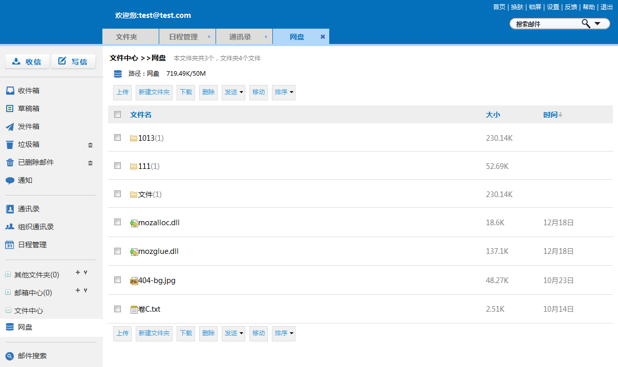 网盘功能可以使用户在邮箱中以目录或文件的方式存储和共享文件。对目录和文件可以进行重命名、删除、移动、下载、共享、取消共享等操作。具有移动磁盘的功能,只要能登录邮箱,便可随时随地存储或下载文件;也可以方便的将网盘中的文件或目录,共享给其他用户,使其可以下载使用。其配置页面如下: