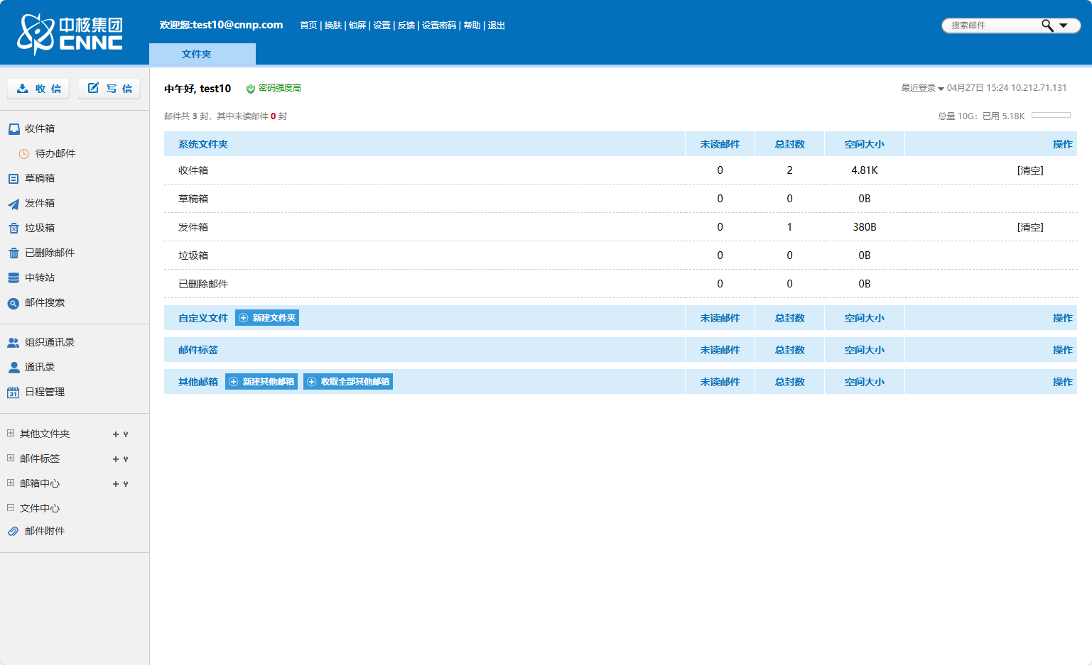 在这里可以清楚的看到邮箱的使用情况,包括邮箱总体容量和已使用容量以及单个文件夹下的邮件总数、未读邮件数、占用空间数等,有利于用户直观统计和合理运用空间。